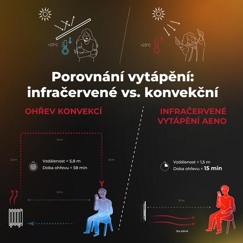 Energeticky úsporná infračervená a konvekční technologie činí ohřívač AENO nákladově efektivnějším než většina tradičních topných systémů, jako jsou klimatizace, plynové ohřívače, ústřední topení a podlahové vytápění.