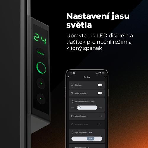 Ochrana proti náhodnému zapnutí dítětem pomocí dětské pojistky v aplikaci. Pro pohodlné a bezpečné používání nastavte teplotu panelu na 60 °C. Pokud ohřívač spadne, automaticky se vypne, spustí se alarm a odešle oznámení na chytrý telefon.