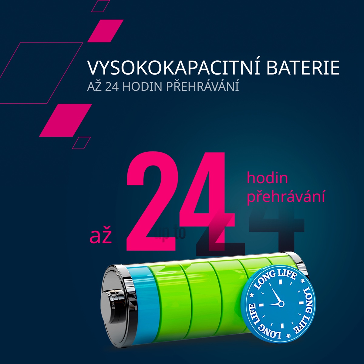 Vestavěná kapacitní baterie nabízí dlouhou výdrž a rychlé nabíjení, takže si můžete vychutnávat svou hudbu déle a čekat méně.