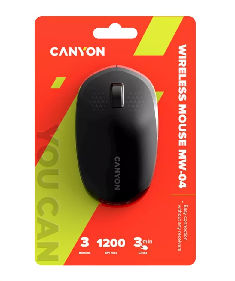 Myš MW-04 od společnosti Canyon je univerzálním řešením na váš pracovní stůl. Díky Bluetooth 5.0 ji lze bez problémů připojit k nejrůznějším zařízením. Optický snímač s rozlišením 1200 DPI je kombinován s inteligentním systémem ú spory energie, který zajistí delší výdrž AA baterie. K dispozici jsou 3 minimalistická tlačítka, která mají životnost až 3 miliony kliknutí. Canyon MW-04 je lehká a kompaktní myš, takže nezabere moc místa a neváží skoro nic. Pokud jste leváci, nemusíte se bát: tato myš je symetrická a tudíž vhodná pro praváky i leváky.