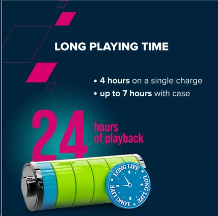 V každém sluchátku je 30mAh baterie, takže na jedno nabití vydrží až 24 hodin přehrávání. Přiložené nabíjecí pouzdro s kapacitou 200 mAh nejenže udrží vaše sluchátka v bezpečí, ale také nabízí několikanásobné další nabití.