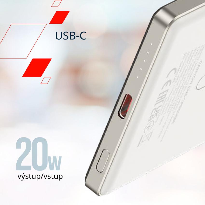 20W port USB-C poskytuje vysokorychlostní nabíjení pro váš telefon, tablet nebo jiné příslušenství. Tento port slouží také jako vstup, takže můžete rychle a pohodlně současně dobíjet samotnou power banku.