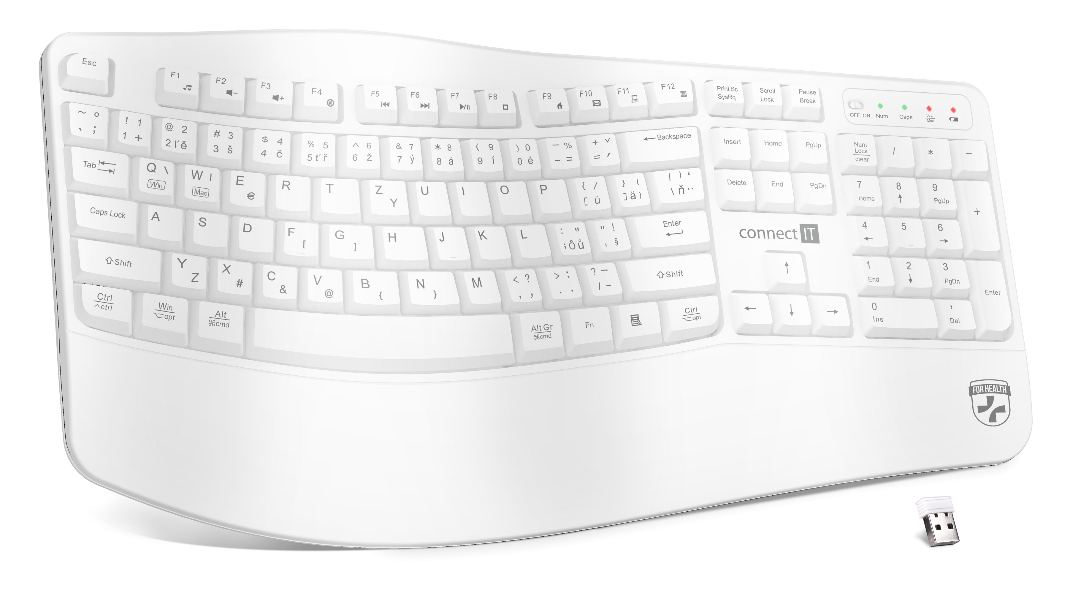 CONNECT IT FOR HEALTH Ergonomická klávesnice, bezdrátová, USB 2.4GHz, CZ + SK verze, BÍLÁ
