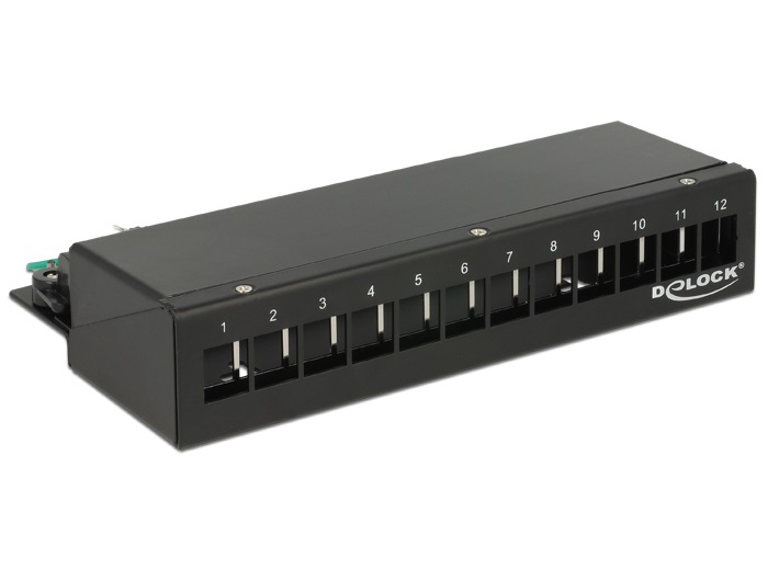 This patch panel by Delock can be used as a junction box on the wall or in enclosures. Additionally, clips for DIN rail mounting are included. With its standardized dimensions, it is suitable for easy snap-in mounting of twelve Keystone modules.
