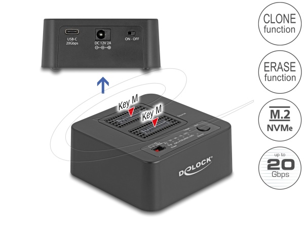 Delock USB 20 Gbps Dokovací stanice M.2 pro 2 x SSD M.2 NVMe PCIe s funkcemi klonování a mazání