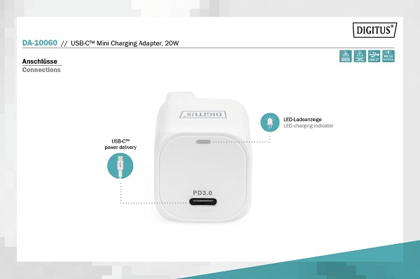 Nabíjecí adaptér DIGITUS® MINI je vhodný pro zařízení USB-C™, jako jsou chytré telefony, tablety nebo notebooky, a poskytuje výkon až 20 W. O aktuálním stavu nabíjení informuje LED displej. Díky super kompaktním rozměrům se nabíječka USB-C™ vejde do každé tašky, díky čemuž je tento nabíjecí adaptér ideálním společníkem pro každodenní použití. Integrovaná ochrana proti zkratu, přepětí a nadproudu poskytuje zvýšenou bezpečnost. Integrovaná ochrana proti přehřátí navíc zabraňuje potenciálnímu přetížení a poškození nabíječky nebo připojených zařízení.
