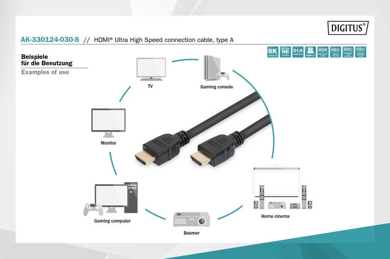 Tento výkonný kabel HDMI podporuje všechny funkce HDMI Ultra High Speed (verze 2.1), jako jsou ARC, CEC, HEC, lip sync, 3D ve 4K, Dolby True HD, Multi Stream A/V, formát 21: 9 a 32kanálový zvuk.
