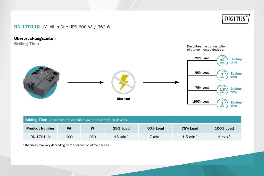 DIGITUS UPS vše-v-jednom, 800VA / 480W, LED 12V / 9Ah x1, 4x CEE 7 / 7,3x IEC C13, USB, RJ45