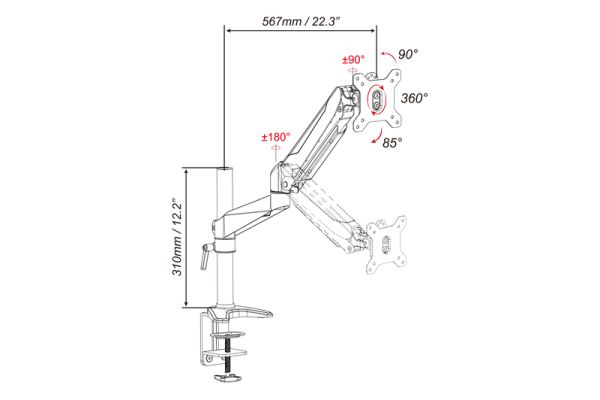 Pomocí držáku stolního monitoru a upínacího přípravku můžete snadno připevnit monitor mezi 15 "- 27" na stůl. Snadno nastavte monitory podle svých potřeb a otočte je, nakloňte nebo otočte, například pokud jde o monitory formátu na výšku. Integrovaná pneumatická pružina usnadňuje nastavení monitoru do správné výšky. Udělejte něco dobrého pro sebe a své zdraví nastavením monitoru do optimální polohy pro vaše tělo a sedadlo. Kabely monitoru lze navíc úhledně uložit v dodaných kabelových trasách.