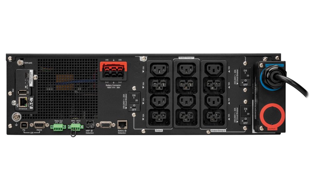 UPS disponuje 6 výstupy C13, 6 výstupy C39 (C13 + C19) a jedním pevným výstupem (hardwired) pro připojení různých typů zařízení. Vstup je řešen pevným připojením (hardwired), což zajišťuje spolehlivé napájení při vysokých zátěžích.