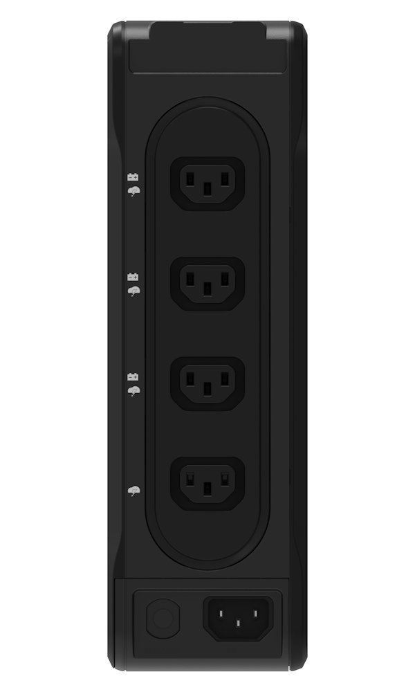 Zdroj je vybaven 3 zásuvkami s ochranou proti přepětí a záložním napájením a 1 zásuvkou pouze s ochranou proti přepětí dle mezinárodních norem IEC. Díky elegantnímu a kompaktnímu designu se zdroj hodí do jakéhokoliv prostředí - můžete jej umístit horizontálně, vertikálně nebo s volitelným příslušenstvím i na stěnu či do racku.