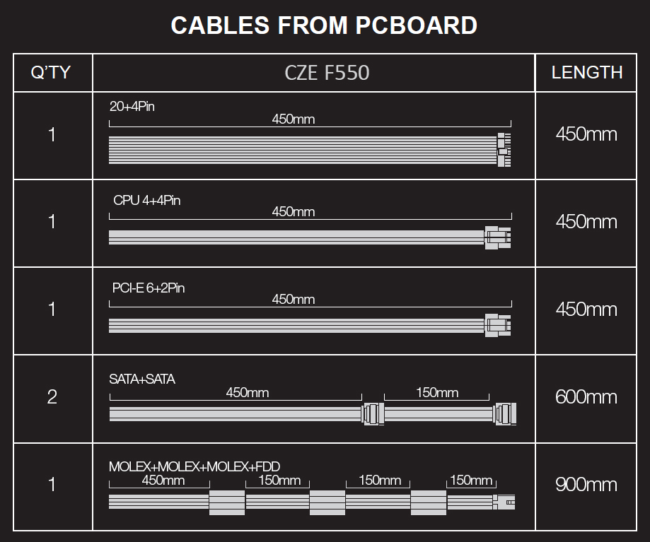 Specifikace • Ventilátor 14 cm, zelený • Aktivní PFC • Certifikace 80+ • Účinnost minimálně 82%/85%/82% při zatížení 20%/50%/100% • Ochrana proti zkratu, přetížení, přepětí a podpětí Kabeláž • 1x MB 20+4pin 450 mm • 1x cpu 4pin (8pin - 4+4) 450 mm • 1x VGA PCI-E 6+2pin 450 mm • 1x MOLEX, 450mm + MOLEX 150mm + MOLEX 150 mm + FDD 150 mm • 2x kabel S-ATA 450mm+ S-ATA150mm • černá barvaProdukt manažer: