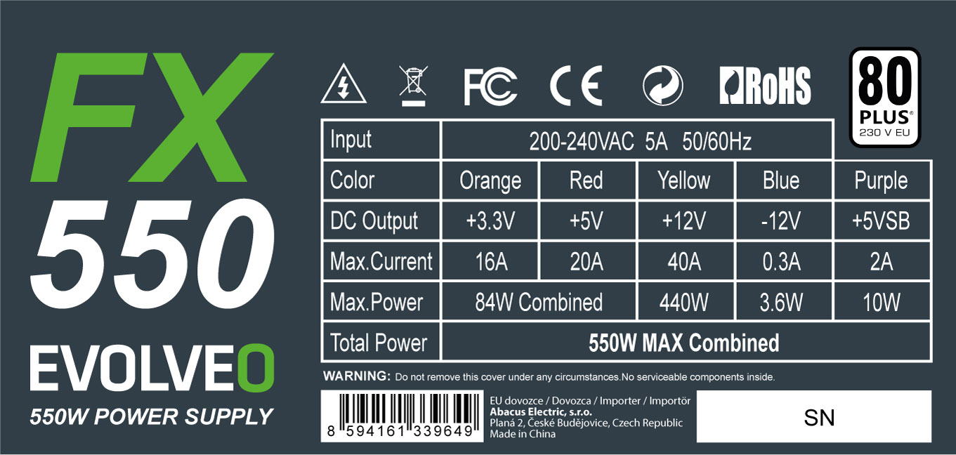 EVOLVEO FX 550,zdroj 550W ATX,14cm,80+,White,3YRW