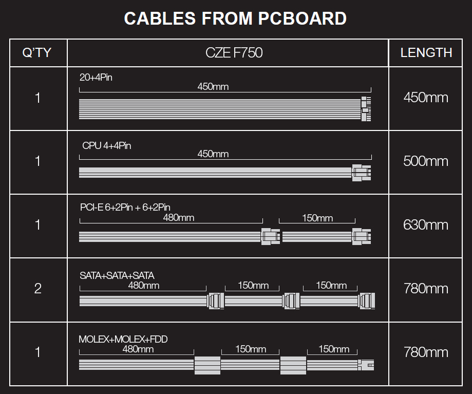 Specifikace • Ventilátor 14 cm, zelený • Aktivní PFC • Certifikace 80+ bronze • Účinnost minimálně 82%/85%/82% při zátížení 20%/50%/100% • Ochrana proti zkratu, přetížení, přepětí, podpětí a tepelná ochrana • semi-pasivní chlazení do 20% zatížení Semipasivní chlazení, ventilátor zdroje je obvykle neaktivní a spustí se pouze při překročení 20% hranice výkonu zdroje. Kabeláž • 20+4 Pin (450mm) • CPU 4+4 pin (450mm) • PCI-E (6+2) +(6+2)pin (450+150mm) • Sata+Sata+Sata (450+150+150mm) • Sata+Sata+Sata (450+150+150mm) • Molex+Molex+FDD (450+150+150mm) • černá barvaProdukt manažer: