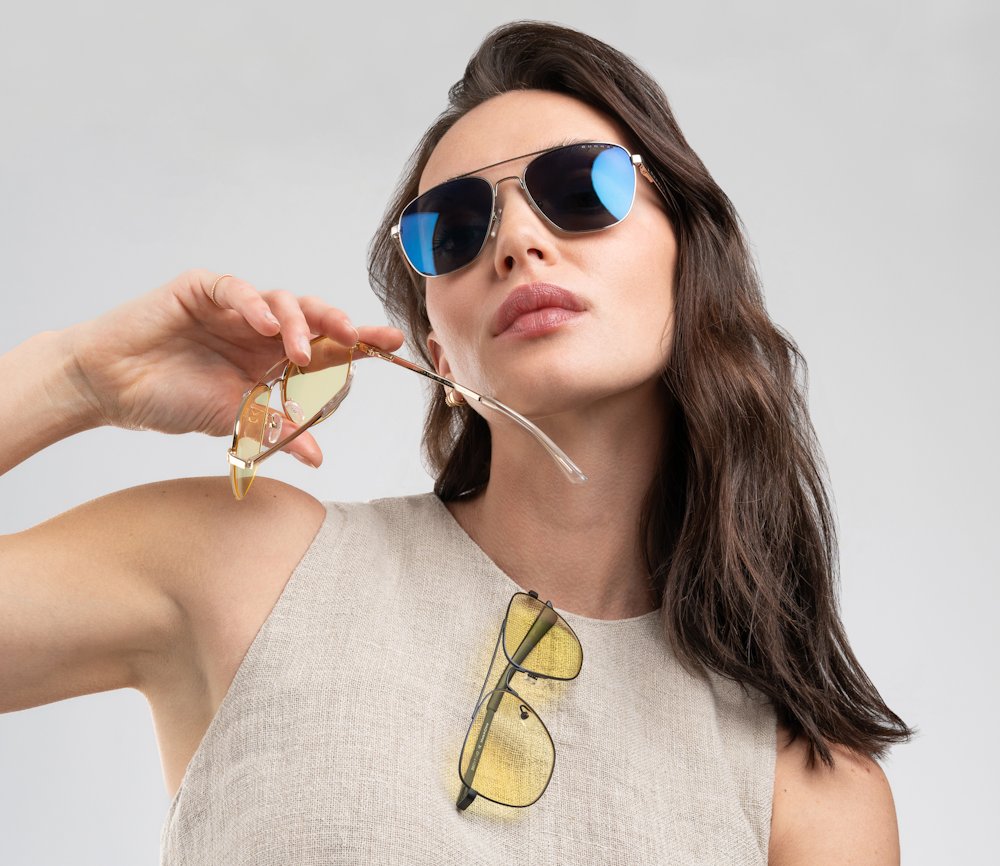 Kancelářské brýle s tmavými skly a jedinečným designem, určené zejména pro venkovní nošení či práci na počítači ve velmi světlém prostředí. Blokují 90 % modrého světla a 100 % ultrafialového záření, díky čemu minimalizují zatížení očí a celkovou únavu. Odolná nerezová ocel zajišťuje lehké, ale přesto pevné nošení.