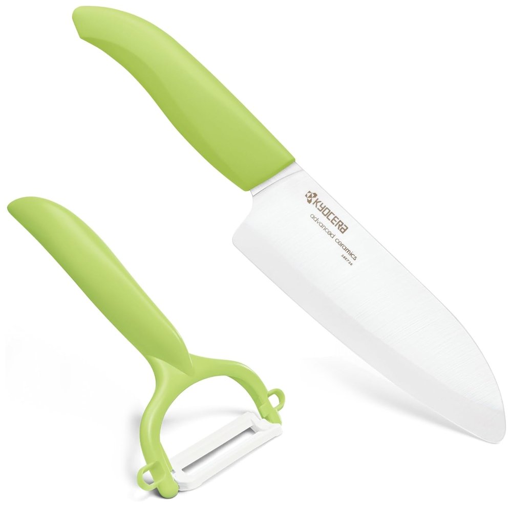 Dárková sada na krájení a loupání značky Kyocera se skládá z keramického nože Santoku a škrabky v zelené barvě. S těmito praktickými kuchyňskými pomocníky lze jídlo připravit rychle a snadno. Jsou ideální pro loupání, strouhání a krájení a jsou nepostradatelné v každé moderní kuchyni.