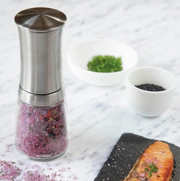 Mlýnek na bylinky a koření od společnosti Kyocera je vybaven nastavitelnými keramickými mlecími kameny, které jednoduše melou a drtí koření na požadovanou jemnost, aniž by při tom změnily jeho chuť. Keramické mlecí kameny mají mnoho výhod – nerezaví, lze je mýt a nemění chuť potravin. Jsou extrémně odolná a ani vlhká mořská sůl pro ně nepředstavuje problém. Mlýnek je ideální pro hrubou sůl, pepřová zrna a další koření, jako je hřebíček, jalovec, koriandr, hořčičná semínka a nové koření.
