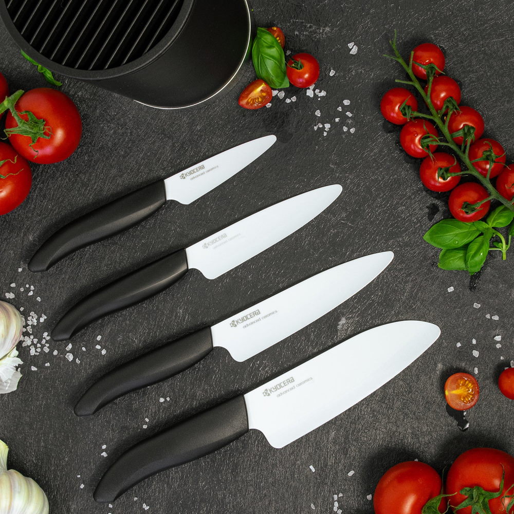 Sada keramických nožů Revolution obsahuje japonský kuchařský nůž Santoku (14 cm), nůž na zeleninu a ovoce (11 cm), univerzální nůž (13 cm) a nůž na zeleninu (7,5 cm). Součástí této sady je elegantní a praktický stojan z měkkého plastu, který pojme 6–8 kuchyňských nožů.Blok na nože je vyroben z měkkého plastu (soft-touch) a krásně vypadá také prémiový pásek z nerezové oceli s vygravírovaným logem Kyocera. Údržba je snadná díky odnímatelné horní části se štěrbinami.