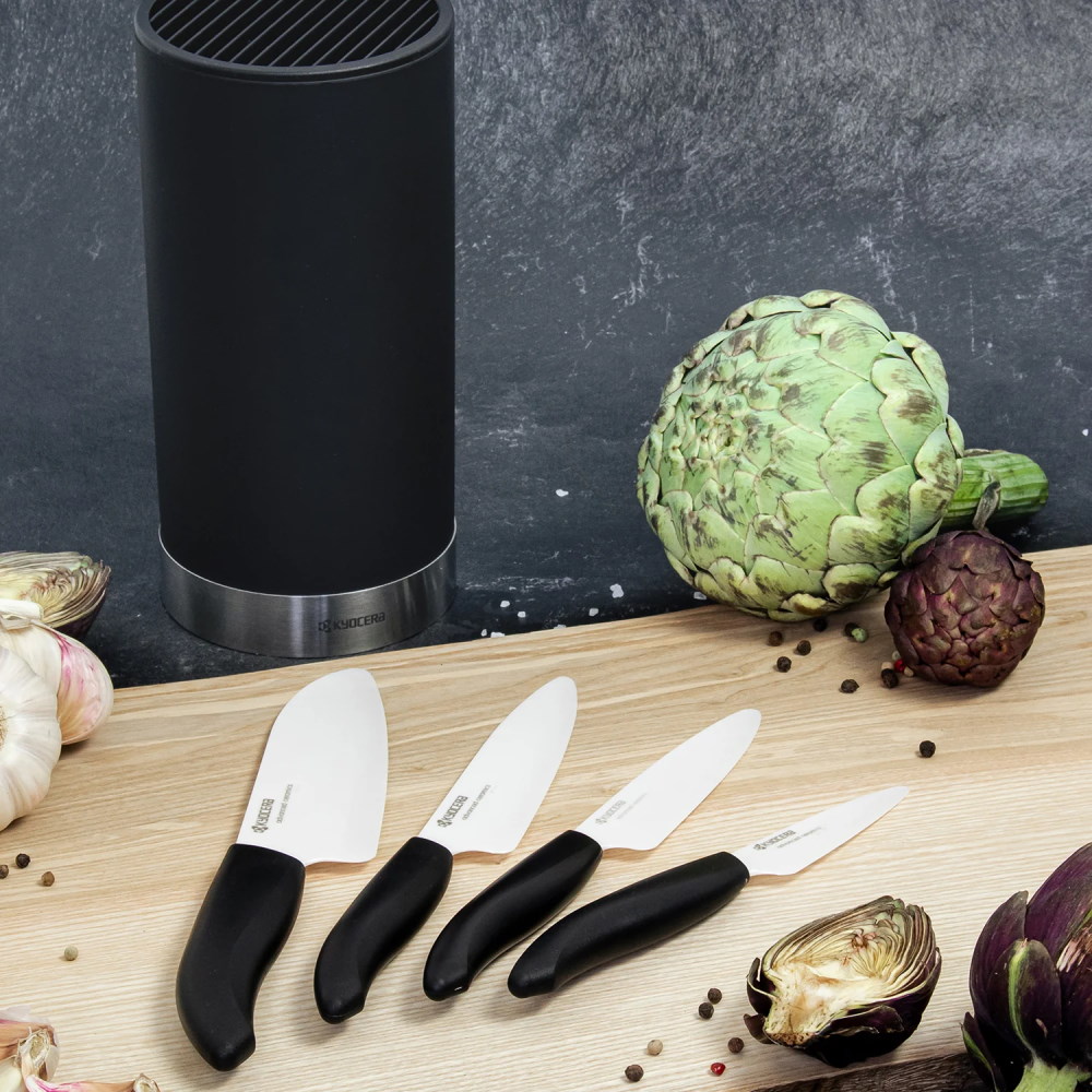 Sada kuchyňských keramických nožů Kyocera Revolution s kulatým stojanem.
