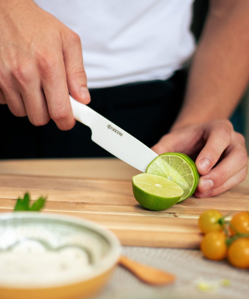 Řada nožů Chowa se vyznačuje extrémně odolnou keramickou čepelí Z212, která díky inovativní výrobní metodě zůstává ostrá až dvakrát déle než jiné keramické čepele Kyocera. Měkká rukojeť, inspirovaná tradičním japonským kladivem, hladce padne do ruky a díky ergonomickému tvaru zabraňuje únavě zápěstí.