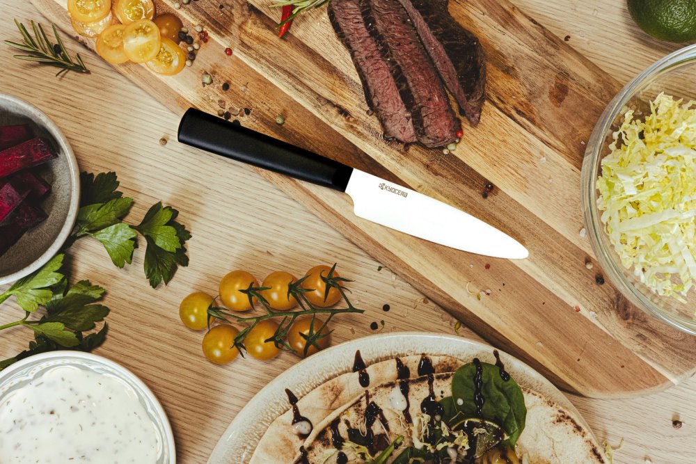 Nůž na rajčata z řady Chowa značky Kyocera s vroubkovanou čepelí je dokonalý nástroj pro přípravu rajčat – hladce a jemně prořízne jejich slupku.