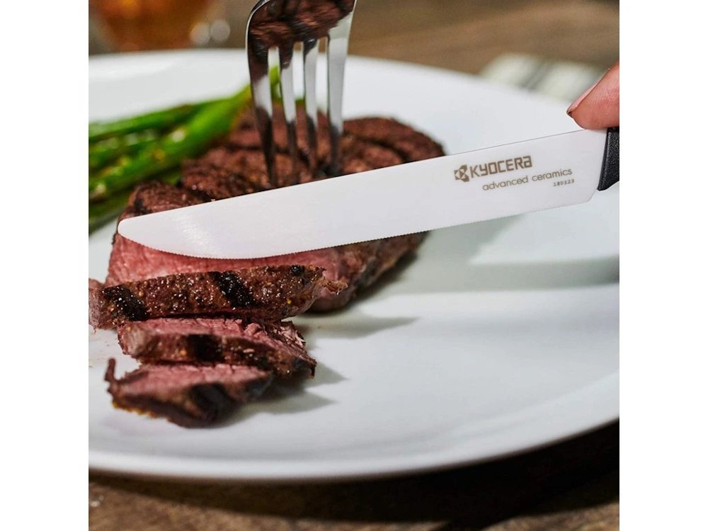 Pro milovníky masa není nic lepšího než dokonale ugrilovaný, křehký a šťavnatý steak. Aby byla zachována dokonalost a maximální požitek od přípravy až po stolování, steakové nože Kyocera s extra ostrými vroubkovanými keramickými čepelemi umožňují čisté a snadné krájení bez nutnosti vyvíjet nadměrnou sílu. Čepele jsou vyrobeny ze zirkonové keramiky – extrémně tvrdého materiálu, který udržuje ostrost. Jejich elegantní vzhled a ergonomicky tvarovaná rukojeť dodají sofistikovanost každému prostírání.