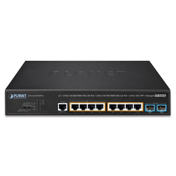 Planet AVS-4210-8HP2X managed AV switch, 8x1Gb, 2x10Gb SFP+, 4x PoE 802.3at + 4x PoE 802.3bt 240W, 0~50°C , QoS