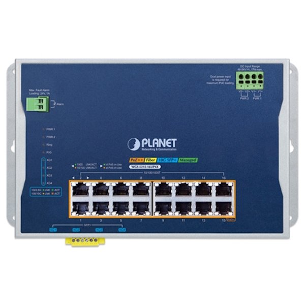 Switch PLANET WGS-5215-16UP4X je určen pro průmyslové instalace vyžadující vysoký výkon a spolehlivost. Disponuje 16 porty 10/100/1000Base-T s IEEE 802.3bt PoE++ podporou až 95 W na port a celkovým PoE budgetem 720 W při duálním napájení. Čtyři 100M/1G/2.5G/10GBase-X SFP+ porty poskytují flexibilní vysokorychlostní uplink s propustností až 112 Gbps.