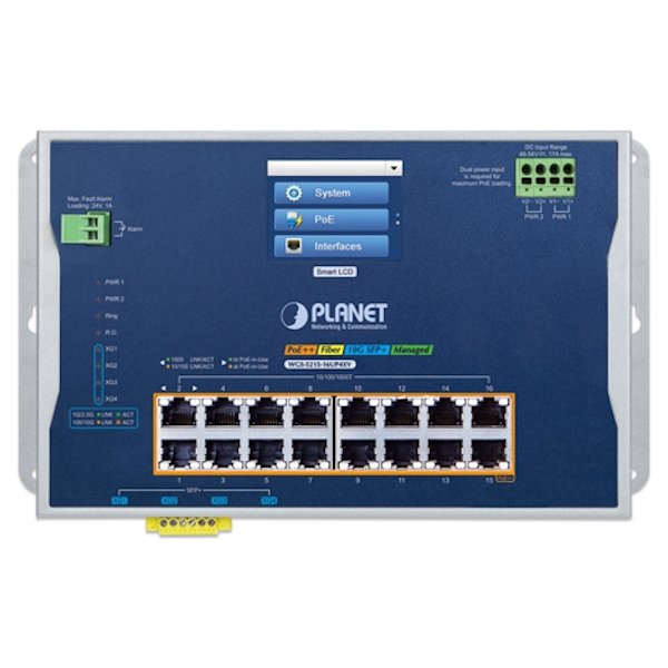 Planet WGS-5215-16UP4XV plochý L2 switch, 16x1GbE 802.3bt 720W, 4x 10 Gbit SFP+, 48-54VDC, -20~70°C, IP30, Displej