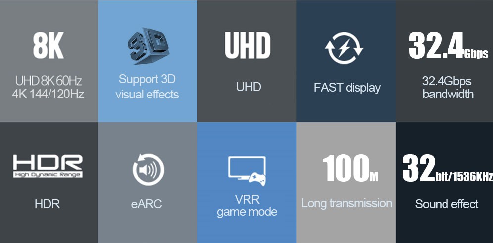 - Kabel podporuje FreeSync a G-Sync, Dynamic HDR a také 32 audio kanálů a mnoho oblíbených audio formátů, např. DTS-HD Master Audio