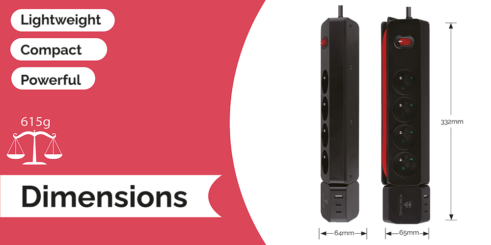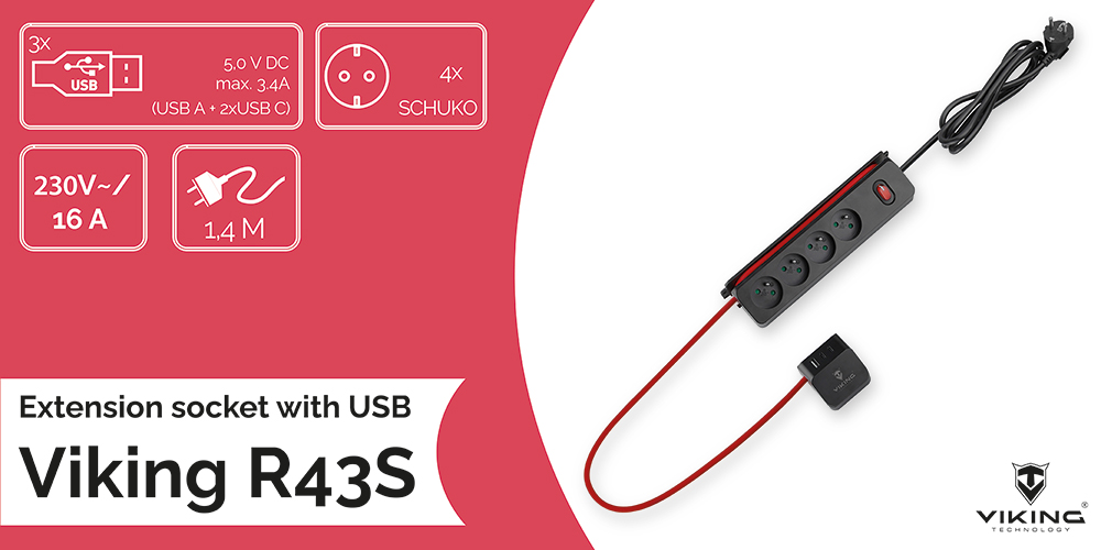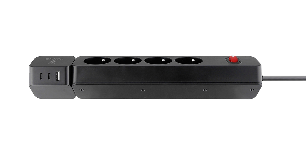 Prodlužovací zásuvka s USB Viking R43S/Output:4xAC,1xUSB-A,2x-USB-C/1,4m kabel a 1,28m kabel
