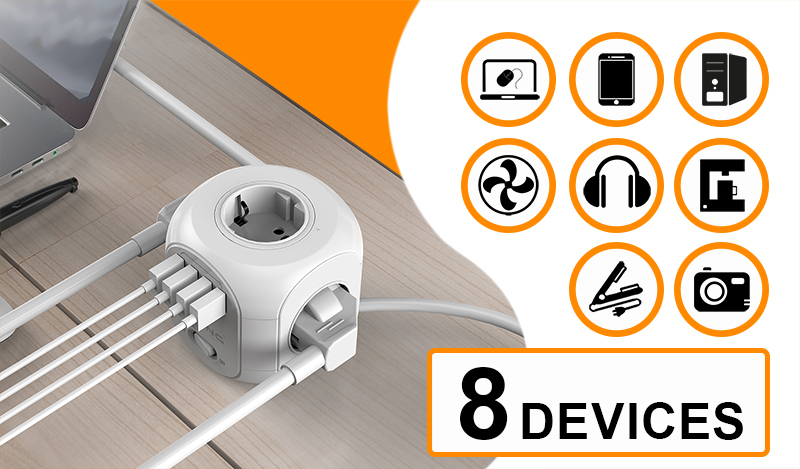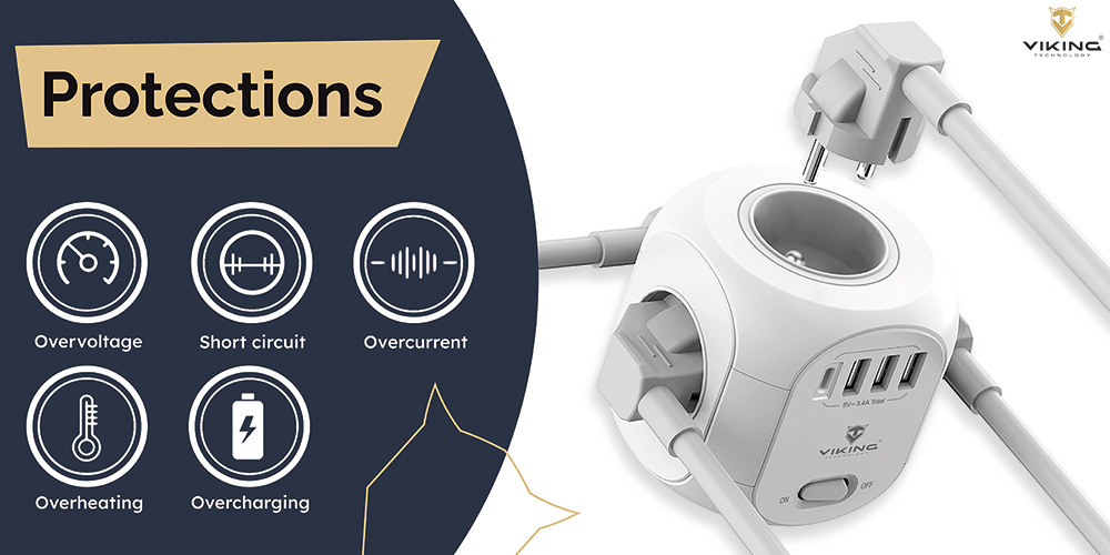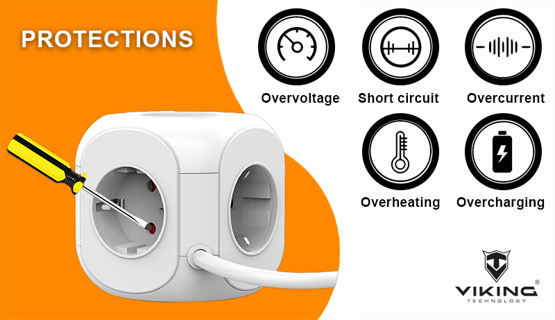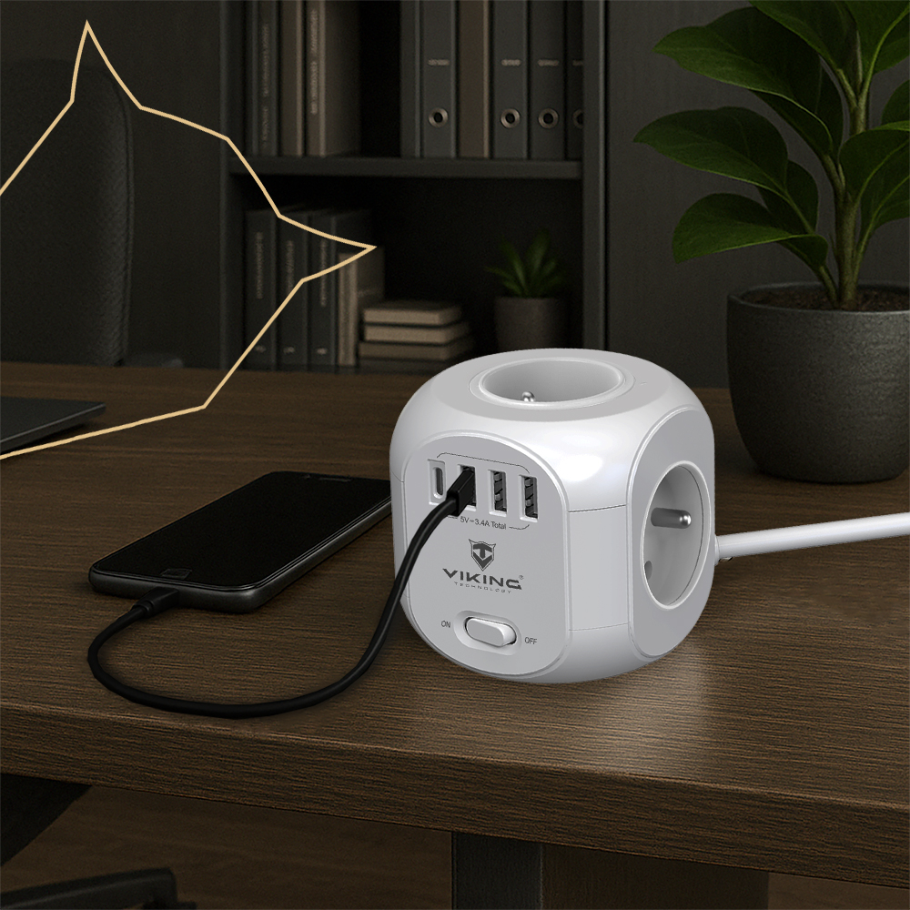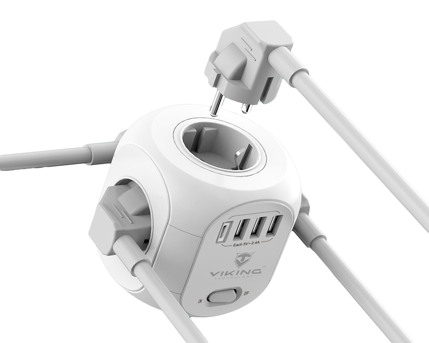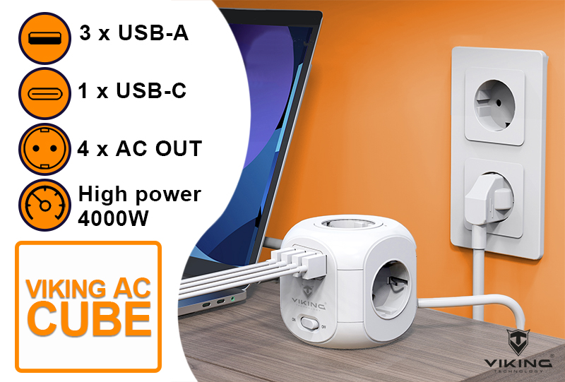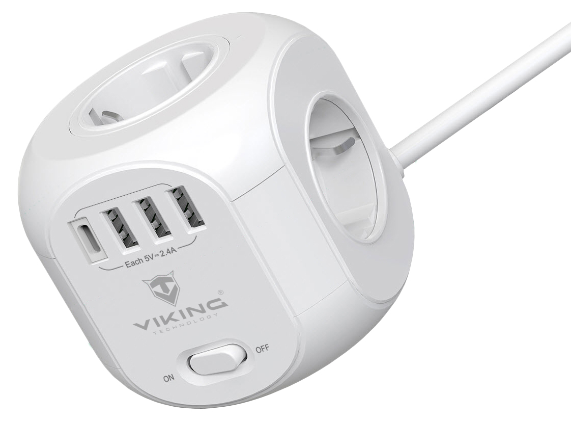 Síťový adaptér Viking AC Cube/Output:4xAC,3xUSB-A,1xUSB-C/Tlačítko ON/OFF/zásuvka typu E