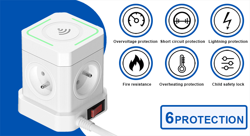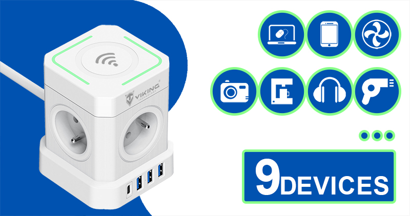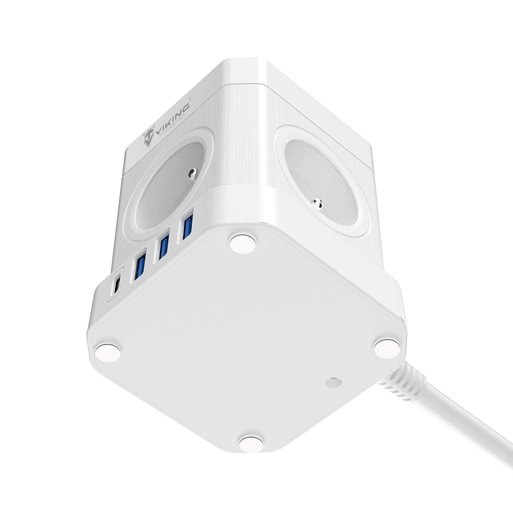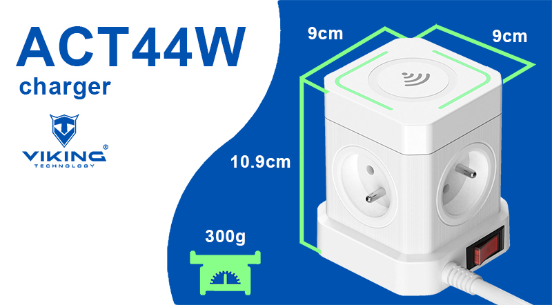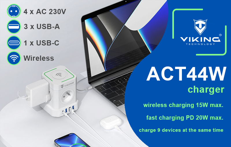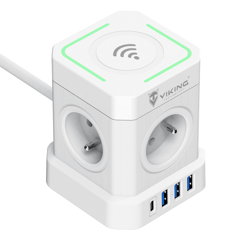Síťový adaptér Viking ACT44W/Output:4xAC,3xUSB-A,1xUSB-C/wireless nabíjení/tlačítko ON/OFF/2m kabel