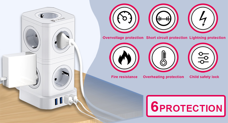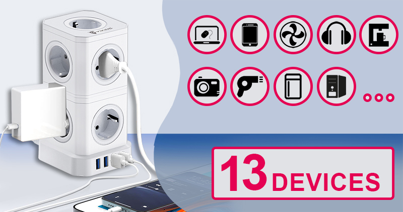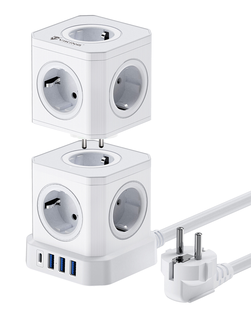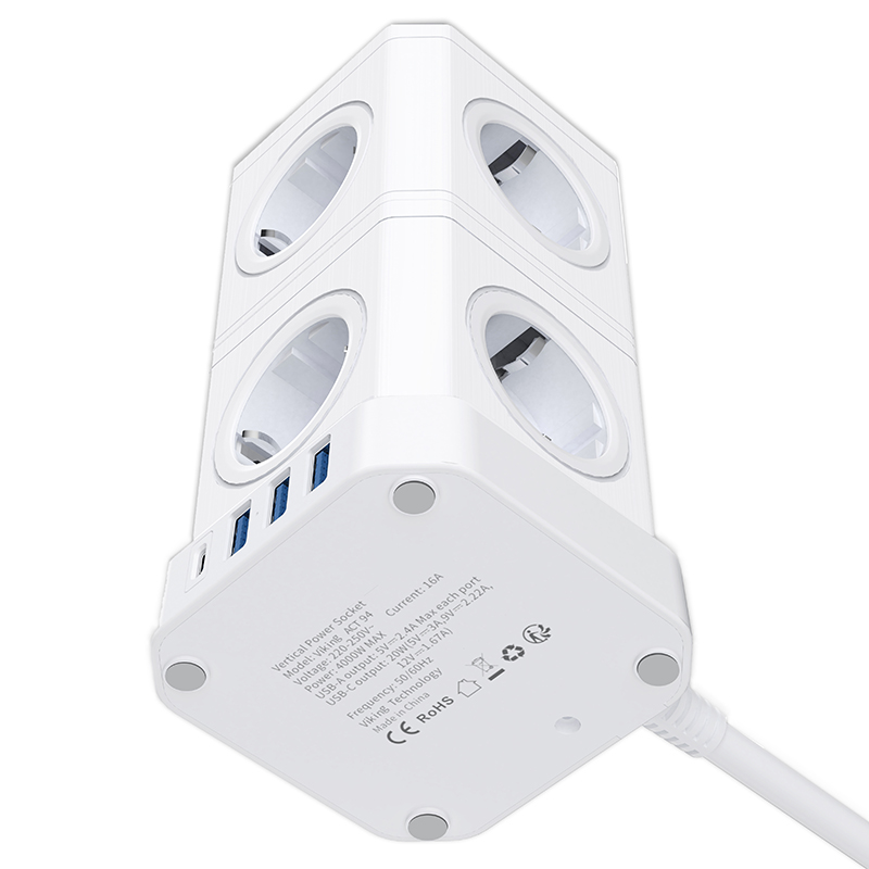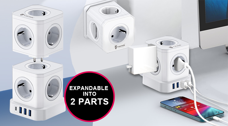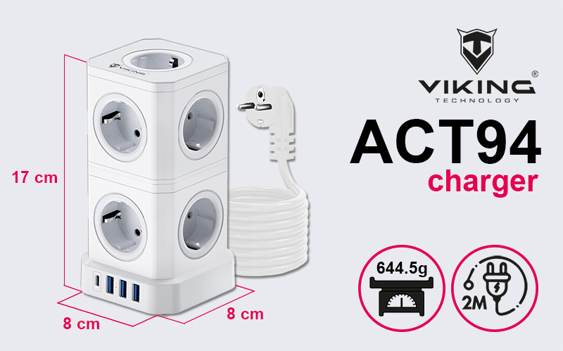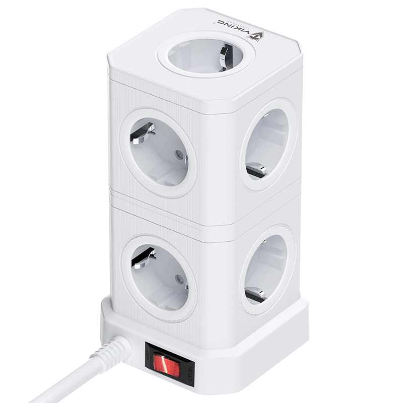 Síťový adaptér Viking ACT94, rozložitelný/Output:9xAC,3xUSB-A,1xUSB-C/Tlačítko ON/OFF/zásuvka typu F