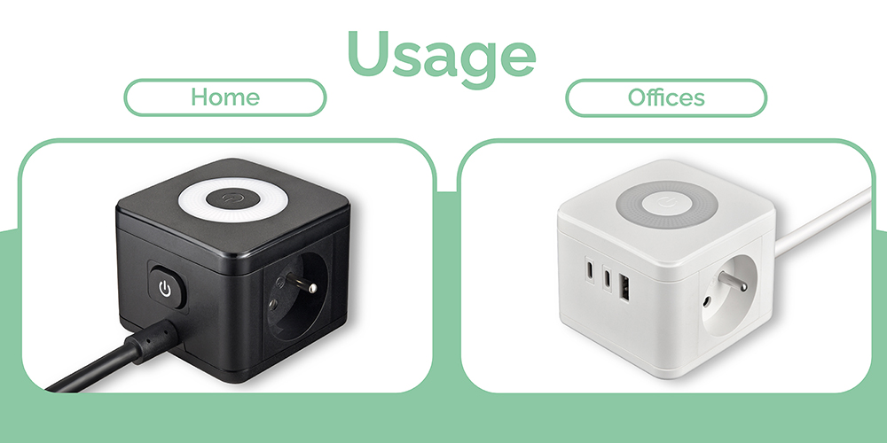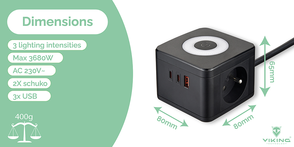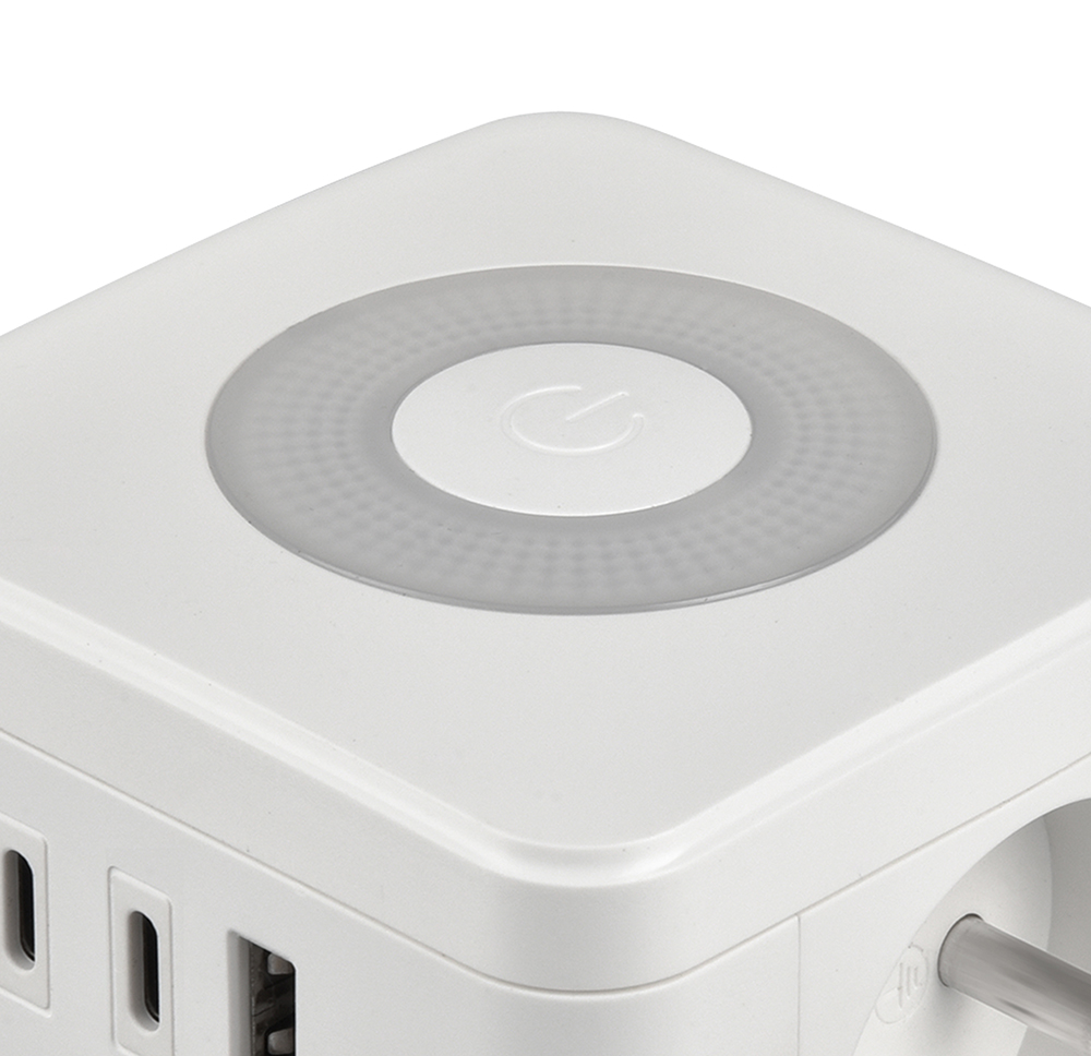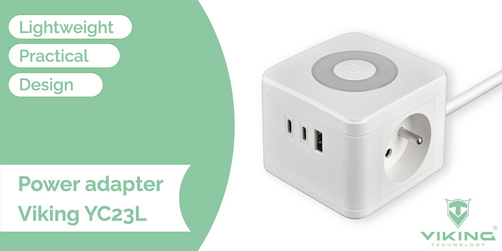 Síťový adaptér VIKING YC23L, bílá/Output:2xAC,1xUSB-A,2xUSB-C/dotykové světlo/1,4m kabel