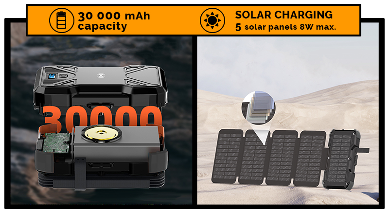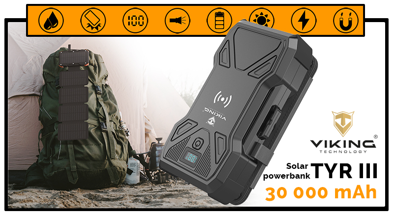 Solární powerbanka VIKING TYR III/Output:1xUSB-C,2xUSB-A/Wireless charge 15W max/30000mAh/LED světlo