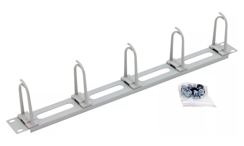 19" vyvazovací panel 1U s šesti velkými háčky a oválnými otvory. Vhodný pro nižší zatížení.